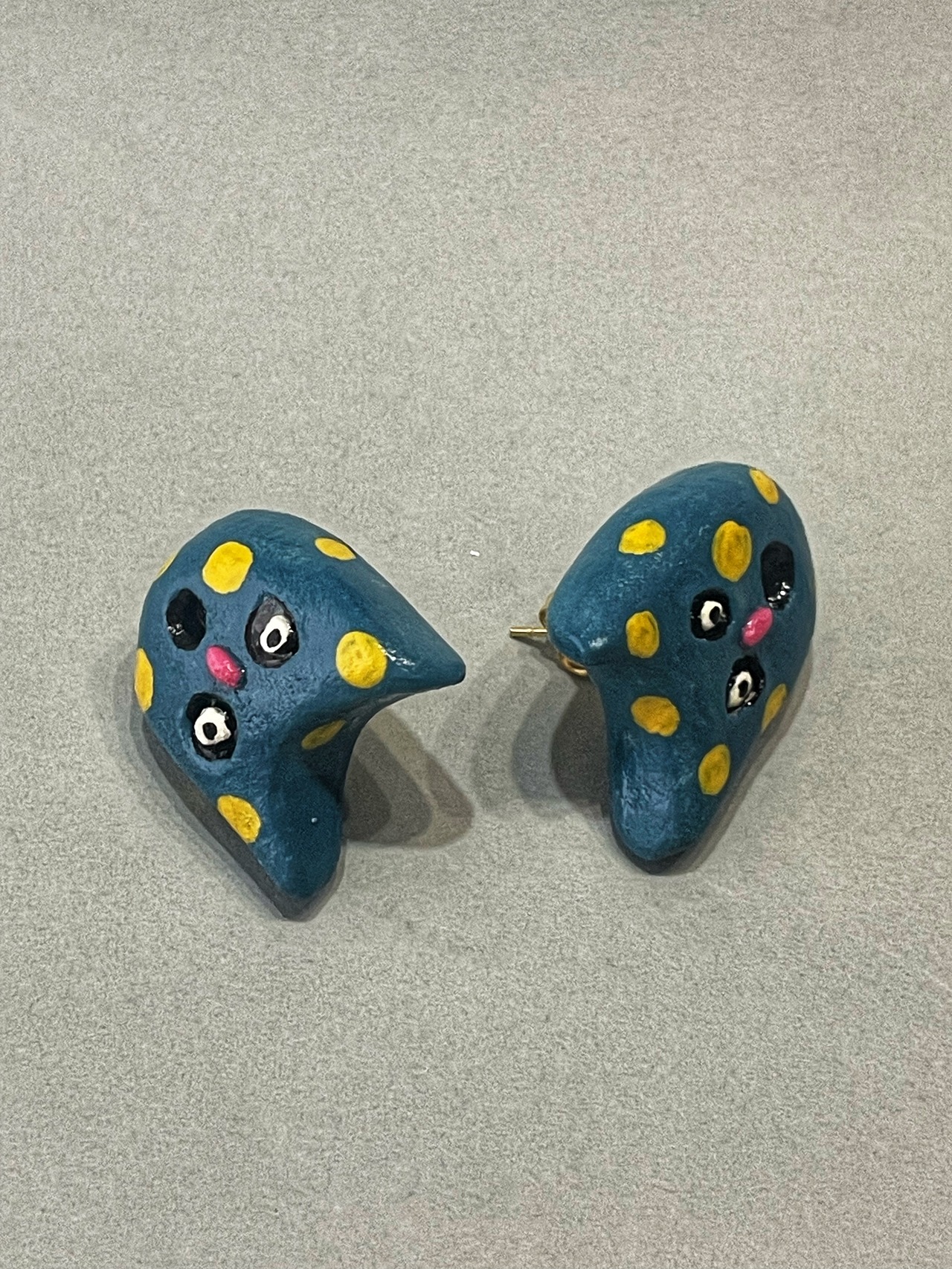 「水玉模様のにゃんこピアス(ブルー)」は、オーブン粘土で手作りしたユニークなにゃんこの顔のピアスです。