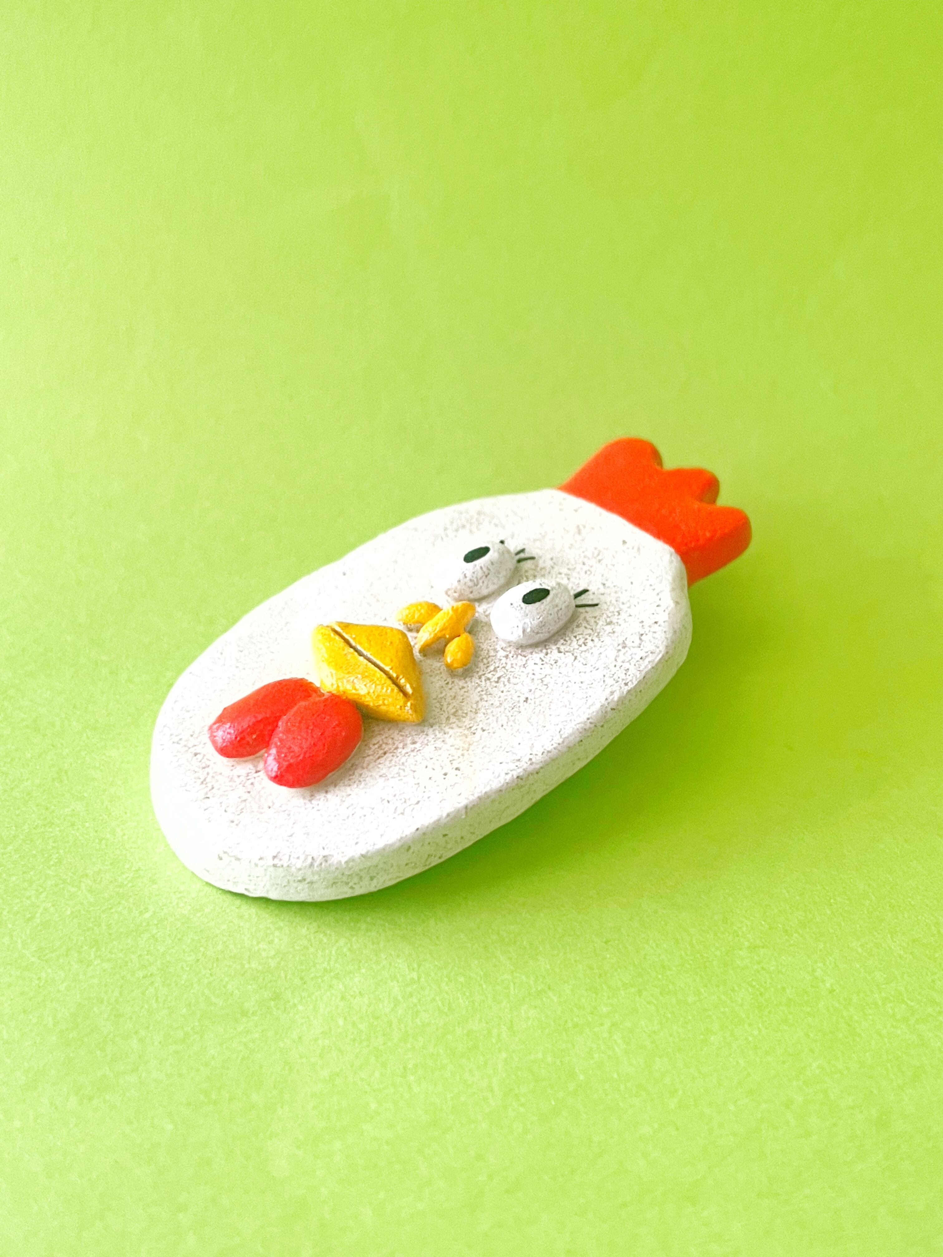 「ニワトリさんブローチ オーブン粘土」は、オーブン粘土を使用して手作りした、元気いっぱいのニワトリさんの顔のブローチです!