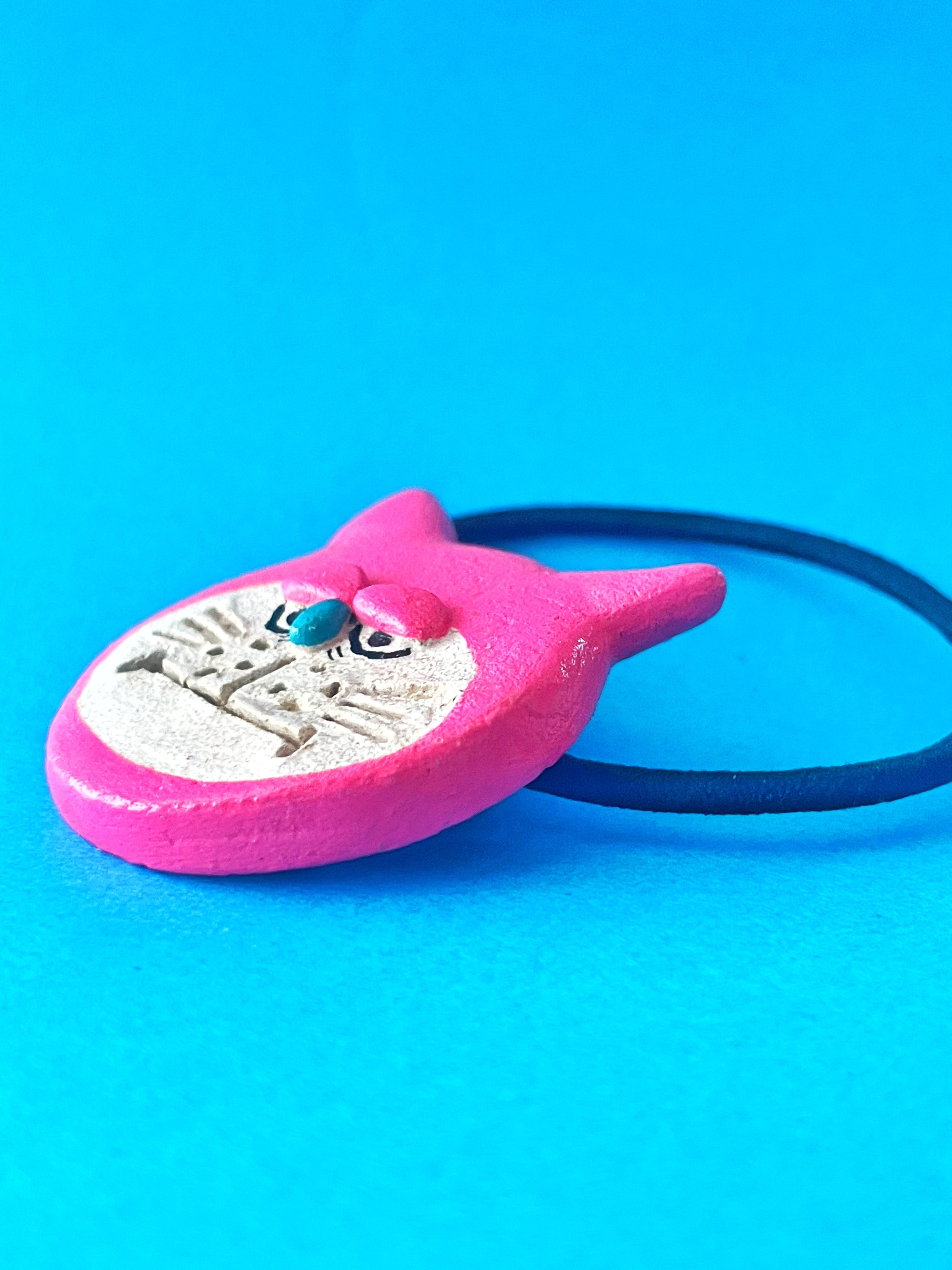 「ピンクにゃんこヘアゴム オーブン粘土」は、オーブン粘土を使用して手作りした、愛らしいピンクのニャンコの顔のヘアゴムです!
