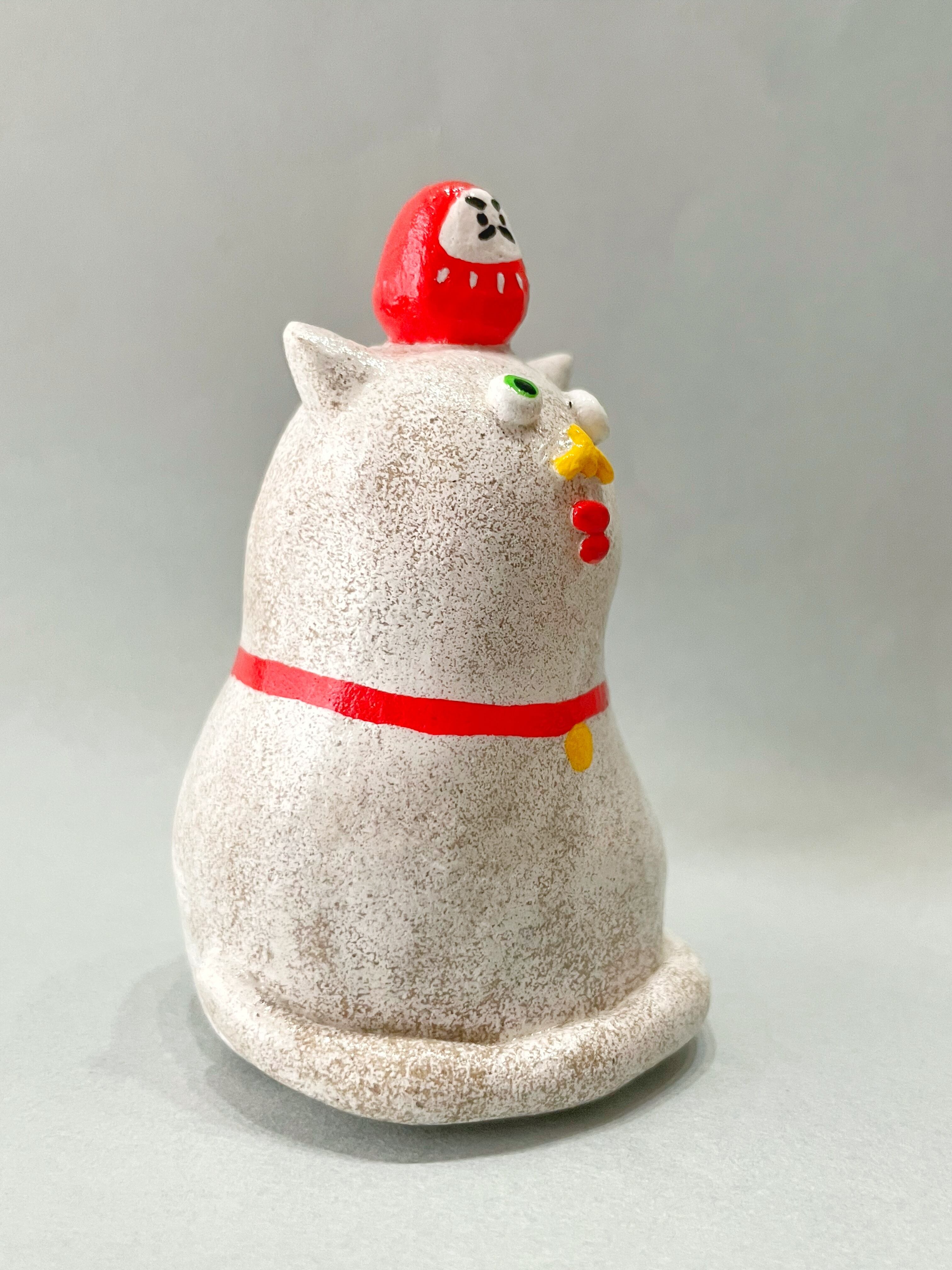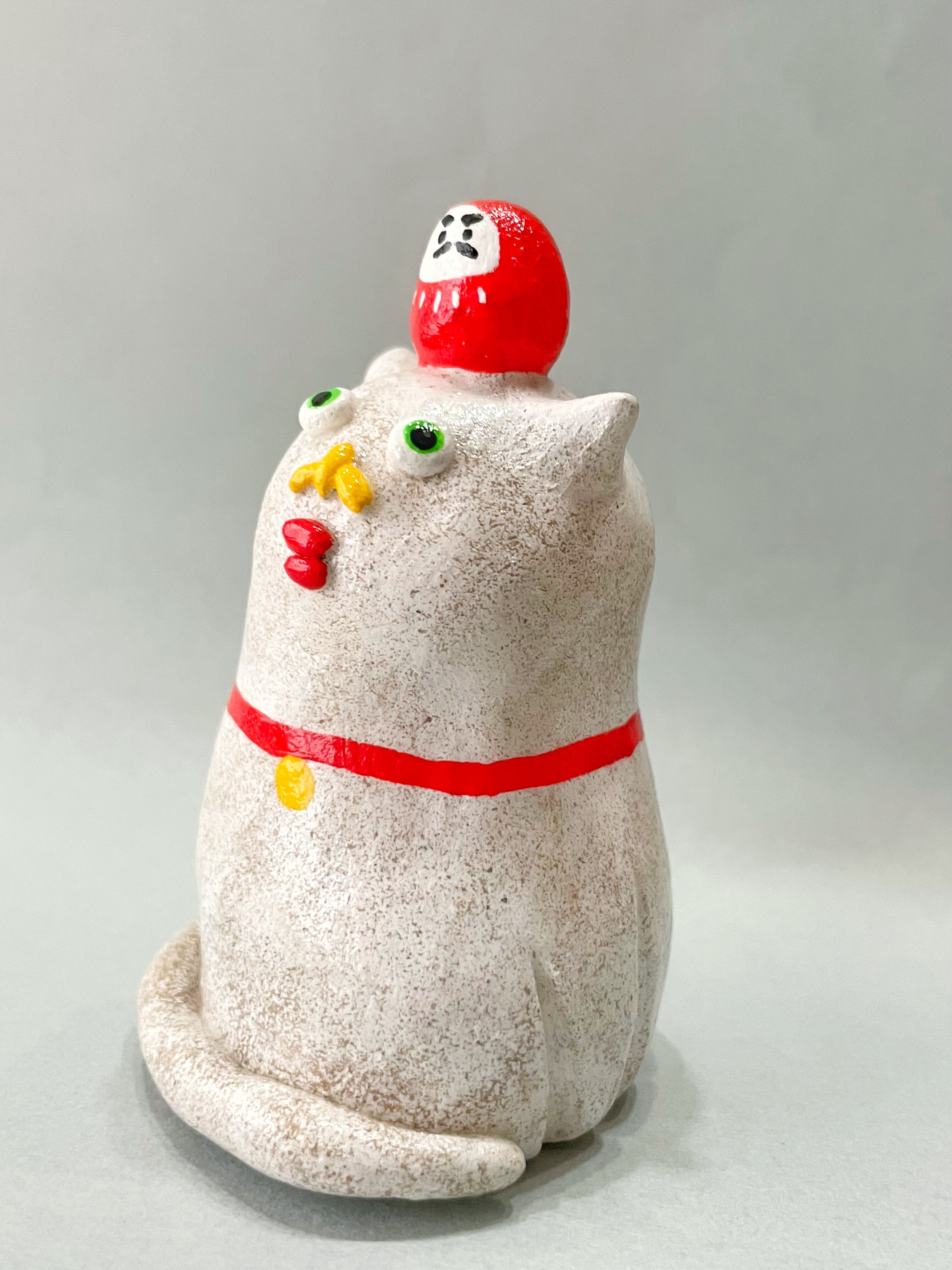 白猫ちゃんの頭の上にちょこんと乗っているダルマさんがとても愛らしい表情を持ち、見ているだけで心が和みます。