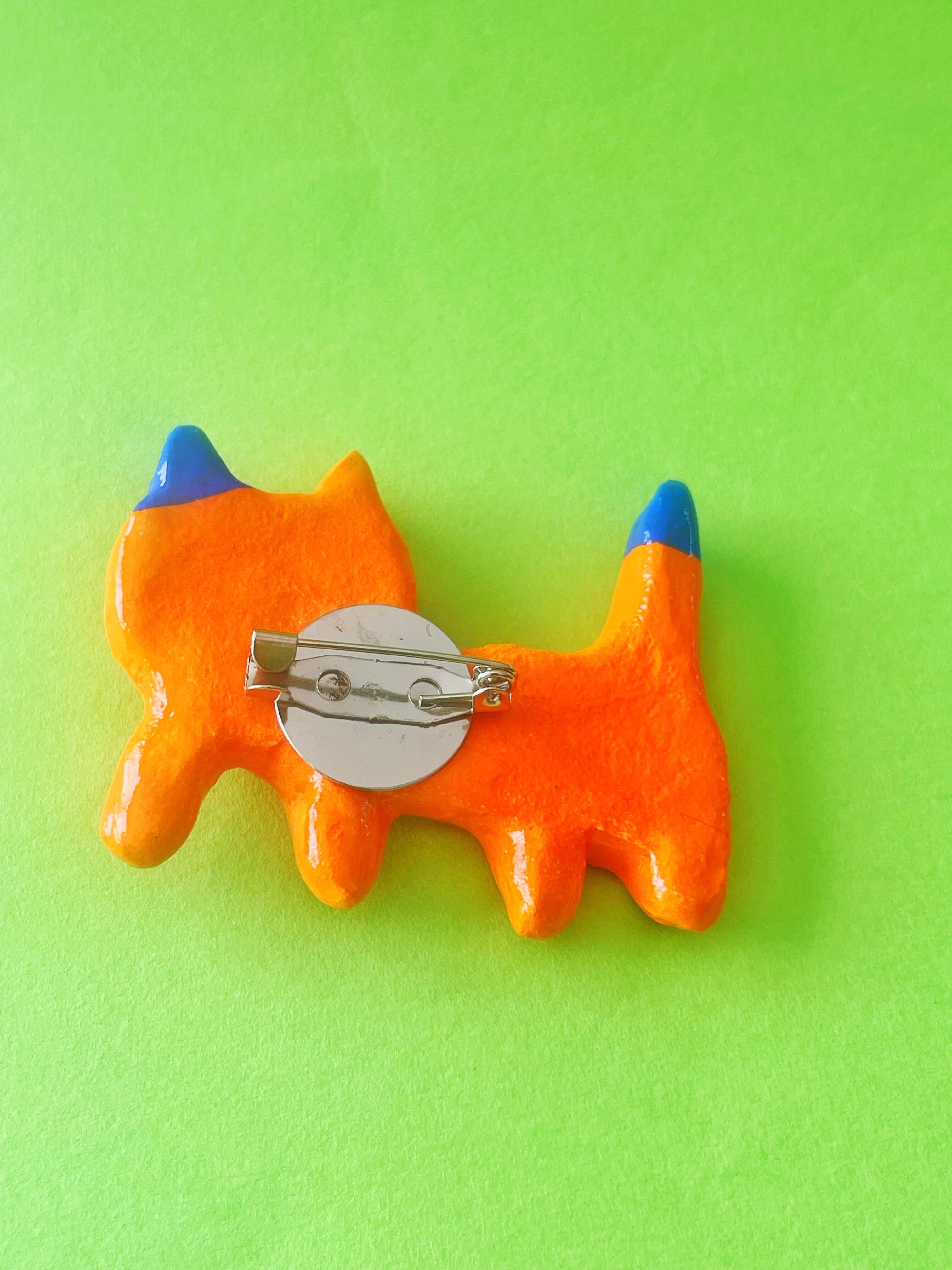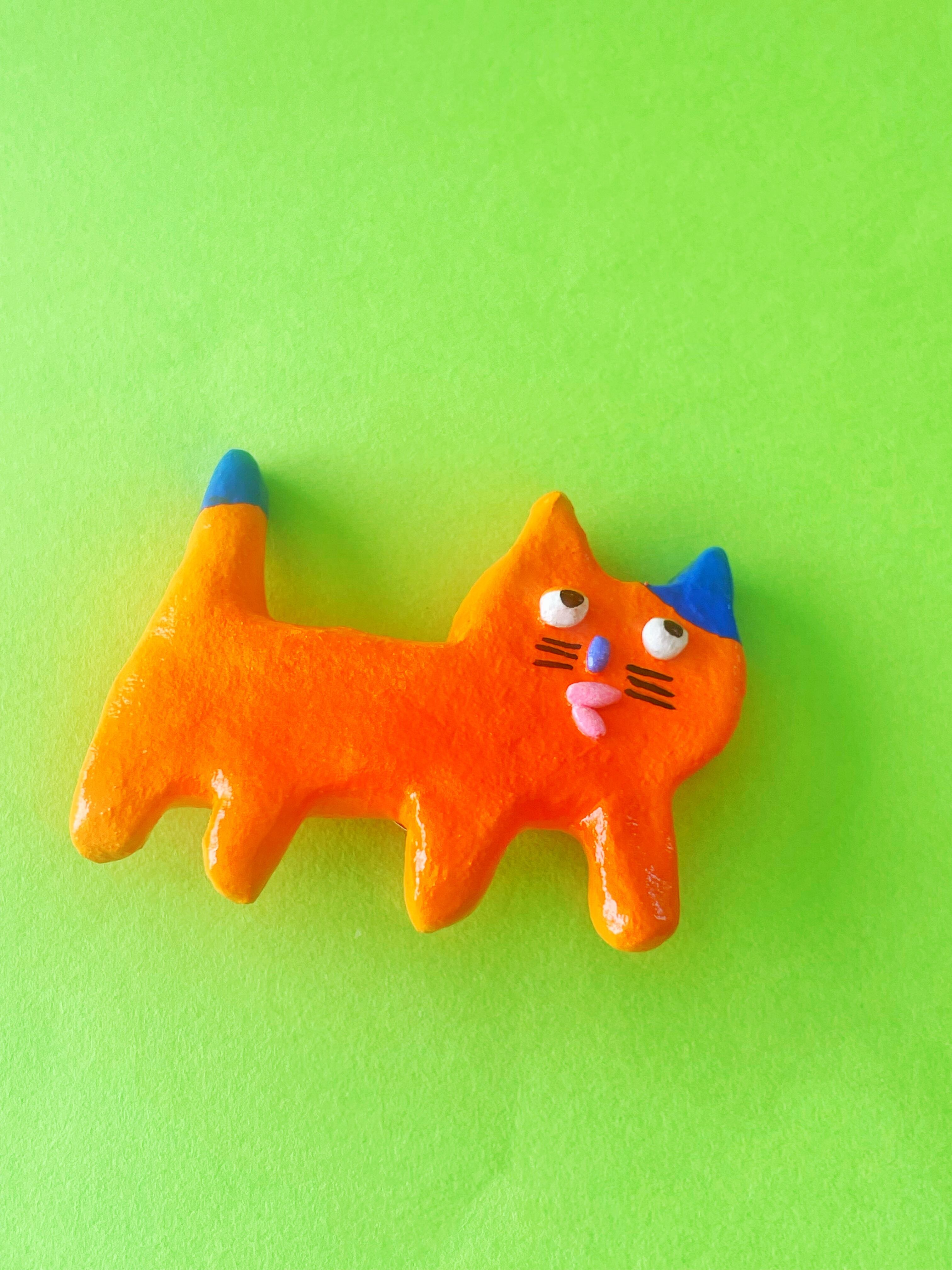 「オレンジニャンコブローチ 石粉粘土」は、石粉粘土を使用して手作りした、元気いっぱいのオレンジ色にブルーの模様が可愛い猫ちゃんのブローチです!