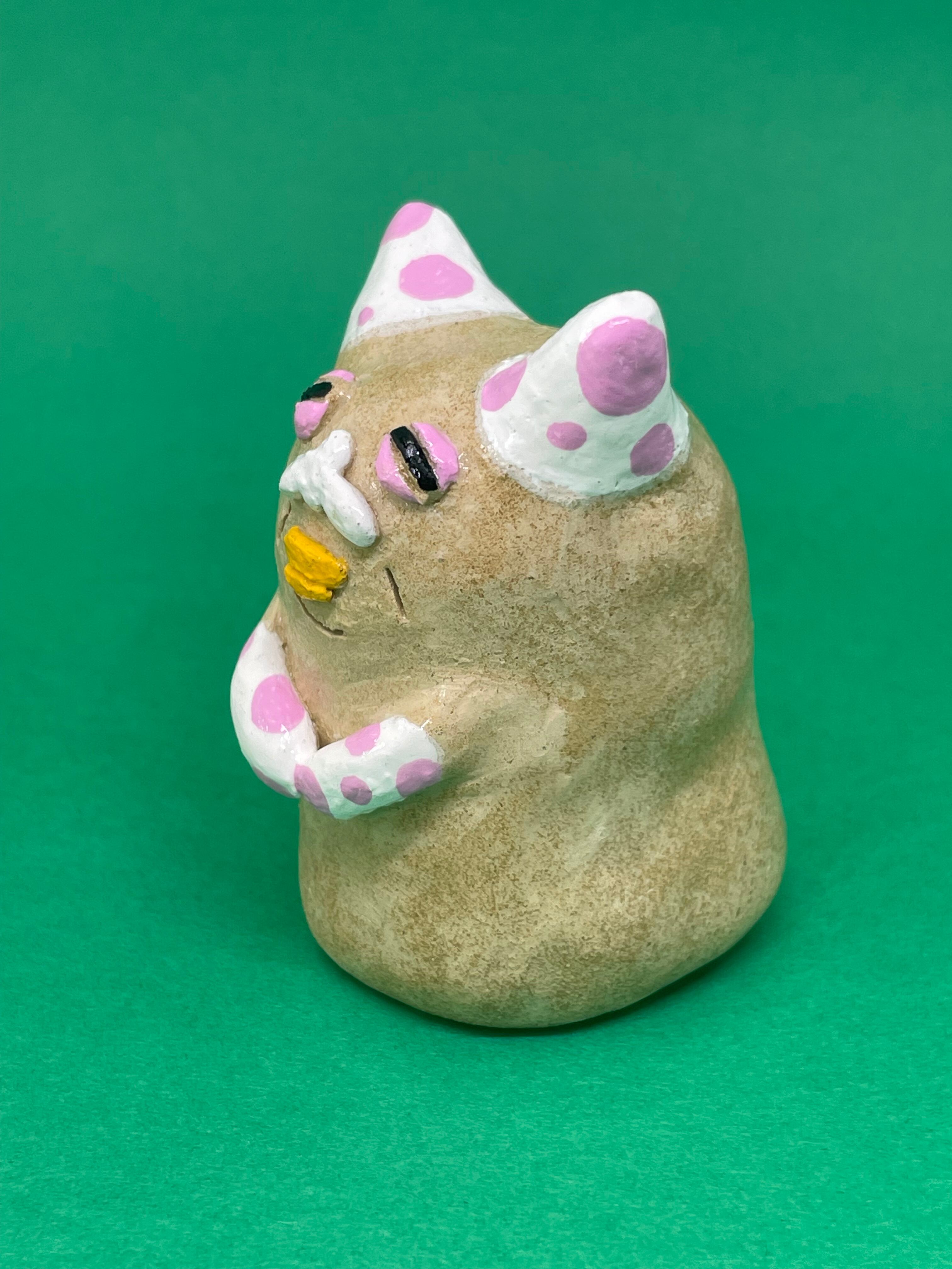 愛らしい水玉模様が特徴の猫のオーブン粘土で作られた置き物です。