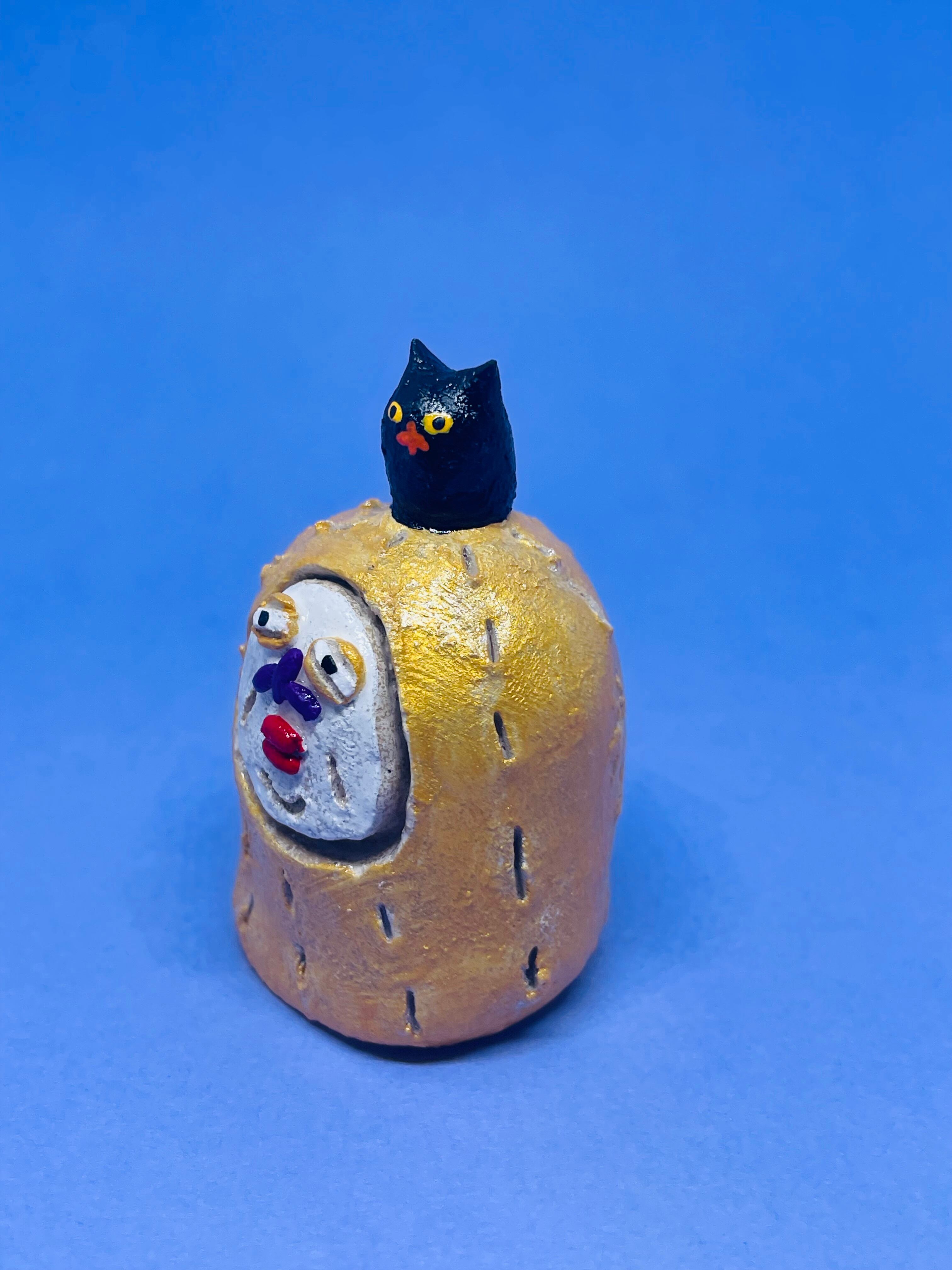 ハロウィンを彷彿とさせる黒猫を乗せたオーブン粘土で作った神さま。
